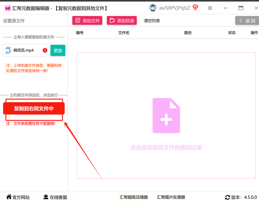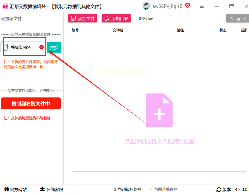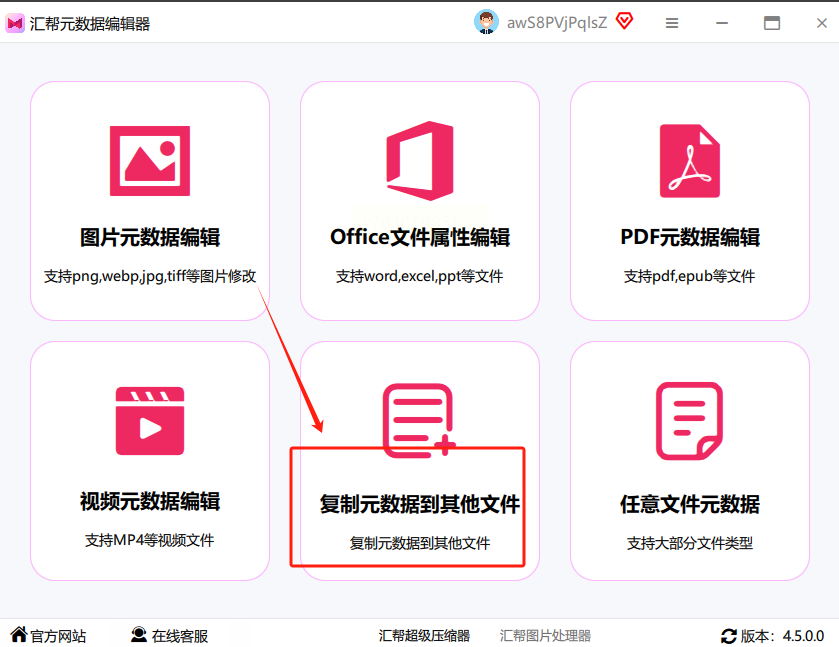 步骤1:打开“汇帮元数据编辑器”软件。启动后,你会看到主界面,这里列出了各种功能选项。找到并点击“复制元数据到其他文件”这个按钮,它会带你进入一个专门的页面,这里就是操作的核心区域。