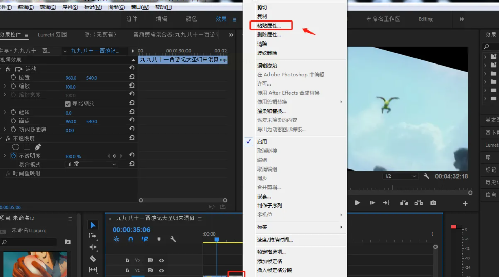 步骤5:粘贴属性。接着,右键点击目标视频片段,在菜单中选择“粘贴属性”。PR会应用源视频的元数据到目标视频。完成后,预览一下效果,确保没有错误。