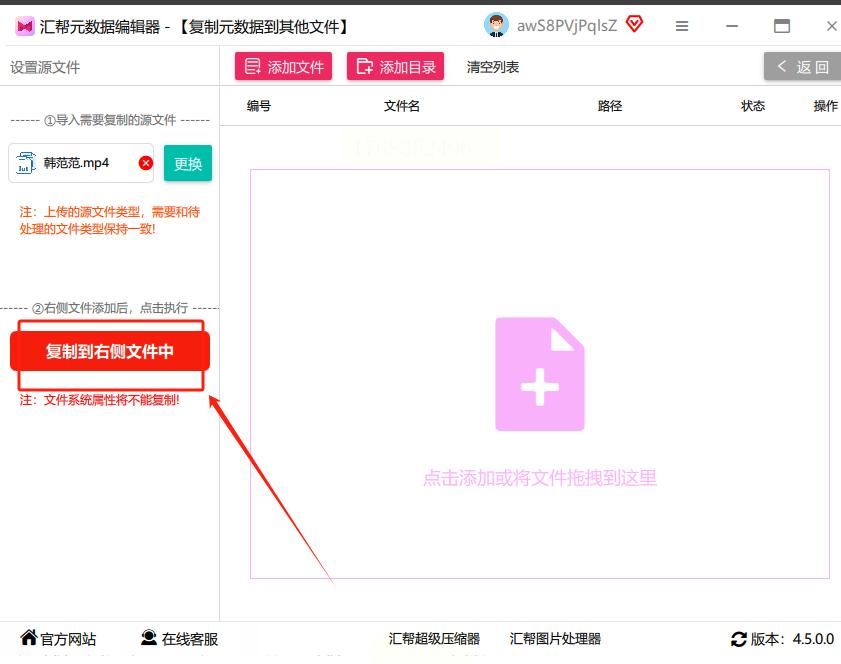 两种方式任你选:①直接拖放:把一堆要复制元数据的视频(比如10个景点的片段)从文件夹拖到右边的“目标文件”区域;②点“添加文件”按钮,一个个选也行。软件支持同时处理20个以上视频,完全满足日常批量需求。
