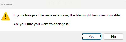 3. 系统会弹出警告,提示你更改后缀名可能导致文件不可用。如果你坚持尝试,点击“是”(Yes)。