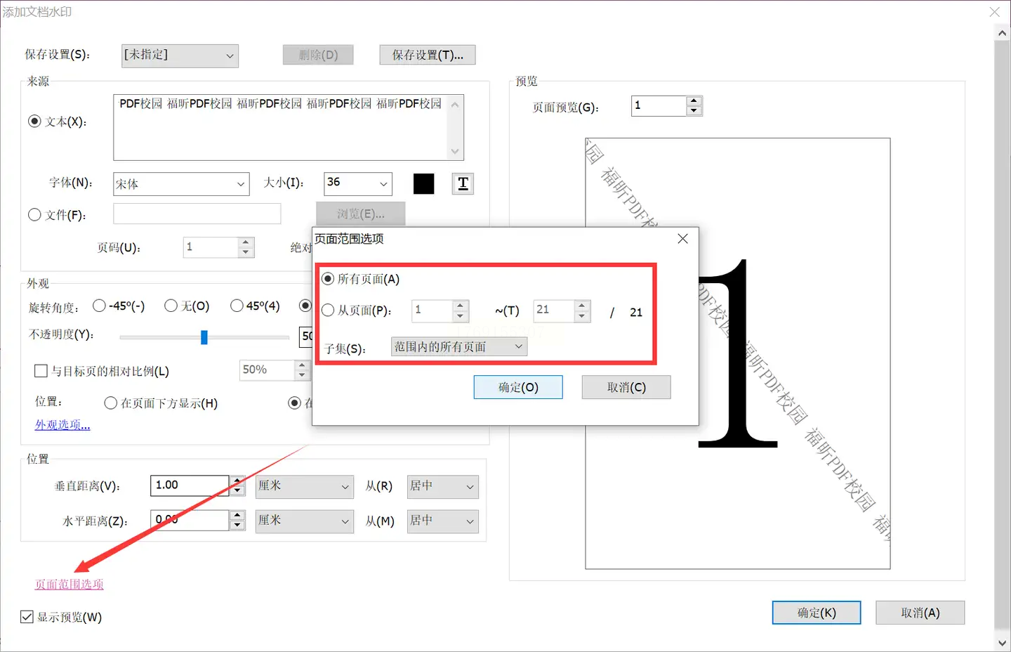 如果水印仅需添加到文档的部分页面,可以点击“页面范围选项”,精确指定应用的页码区间。