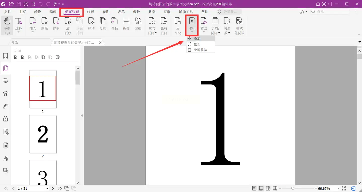 使用该编辑器打开PDF文档,导航至“页面管理”菜单,选择“水印”子菜单下的“添加”命令。
