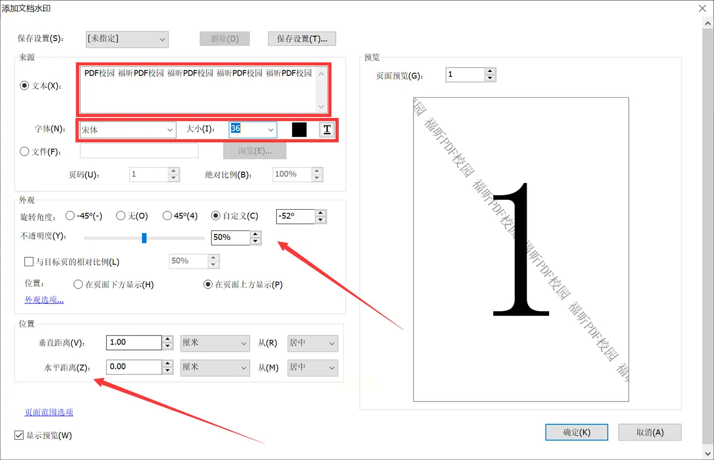 在弹出的对话框中,于“文本”框输入水印文字,并全面设置其字体、颜色、透明度、旋转及布局位置。