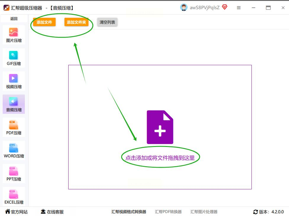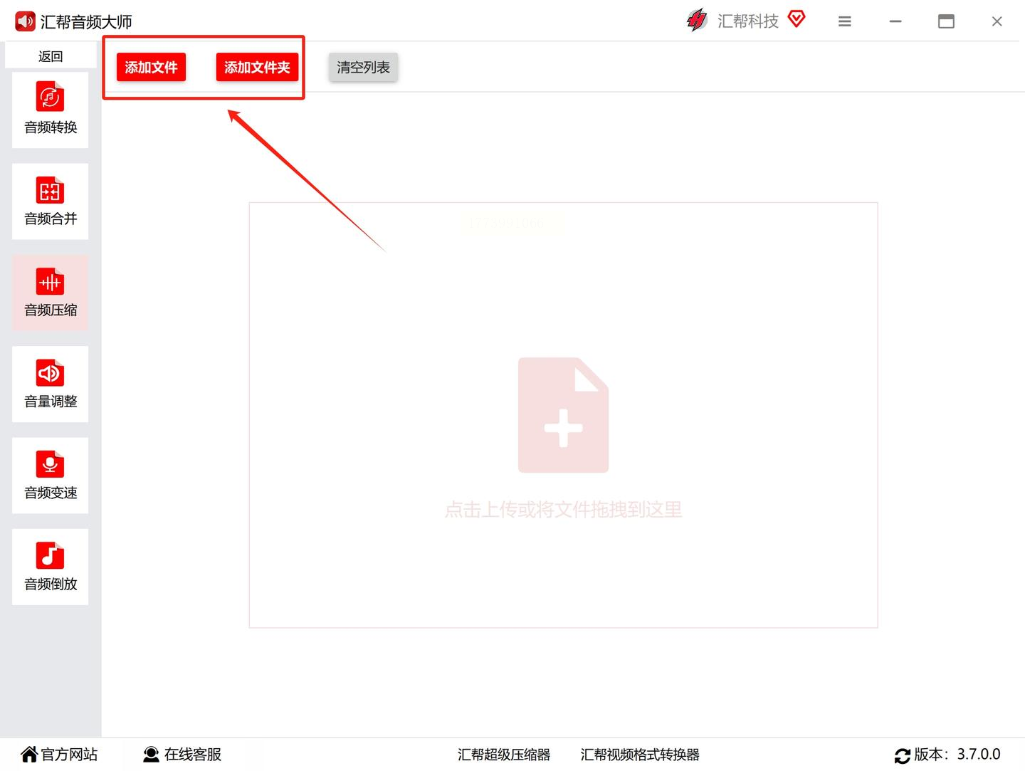 - 点击"添加文件":单个添加音频(支持拖放操作);