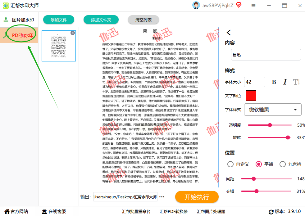 全都设置好了,最后一步就是生成带水印的新PDF文件。在软件下方,找个地方设置一下新文件保存在你电脑的哪个文件夹。然后,放心地点击那个醒目的 “开始执行” 或者 “转换” 按钮。
