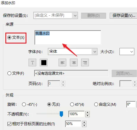 这时会弹出一个“添加水印”的设置页面。在“文本”框里输入你想加的字。下面还可以调整字体、字号、颜色和透明度。你可以一边调,一边看页面背景的实时变化。