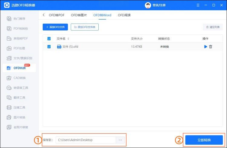 进入操作界面后,你会看到多种格式转换选项。这里我们需要选择“OFD转Word”功能。接下来,你可以通过两种方式上传文件:一是点击左侧的“添加文件”按钮,从电脑文件夹中手动选择单个或多个OFD文件;二是直接将OFD文件拖拽到软件界面指定的上传区域,支持批量上传,非常适合处理多个文件的情况。