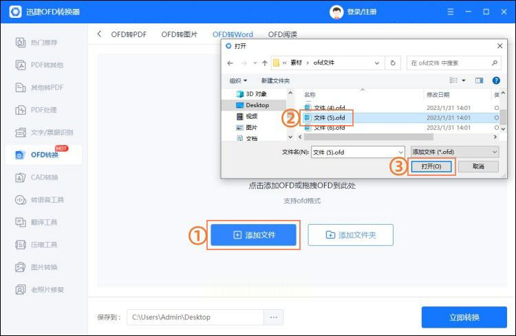 2. 点击“添加文件”按钮,选择OFD文件,或直接拖拽文件到指定区域。