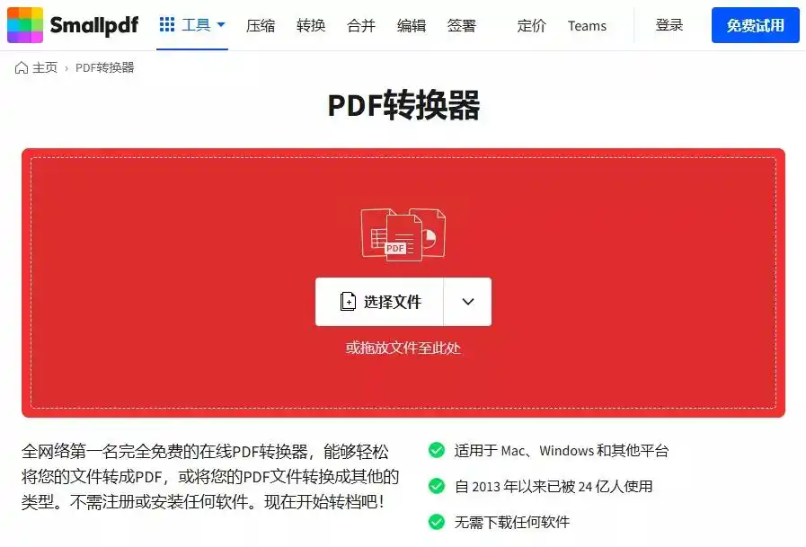1. 打开官网:浏览器搜索「Smallpdf」进入在线转换平台,点击「Excel to Word」功能。