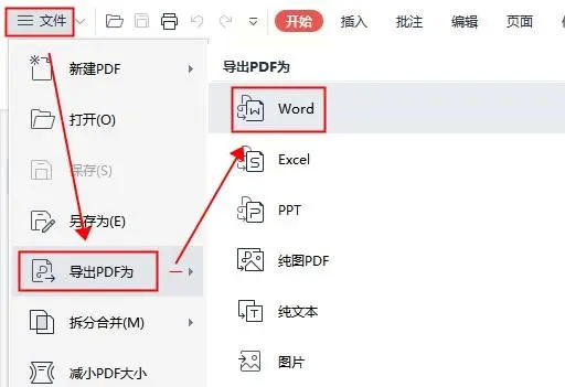 2. PDF转Word:打开转换后的PDF文件,点击「文件」→「导出PDF为」→「Word」,设置输出格式为.docx。
