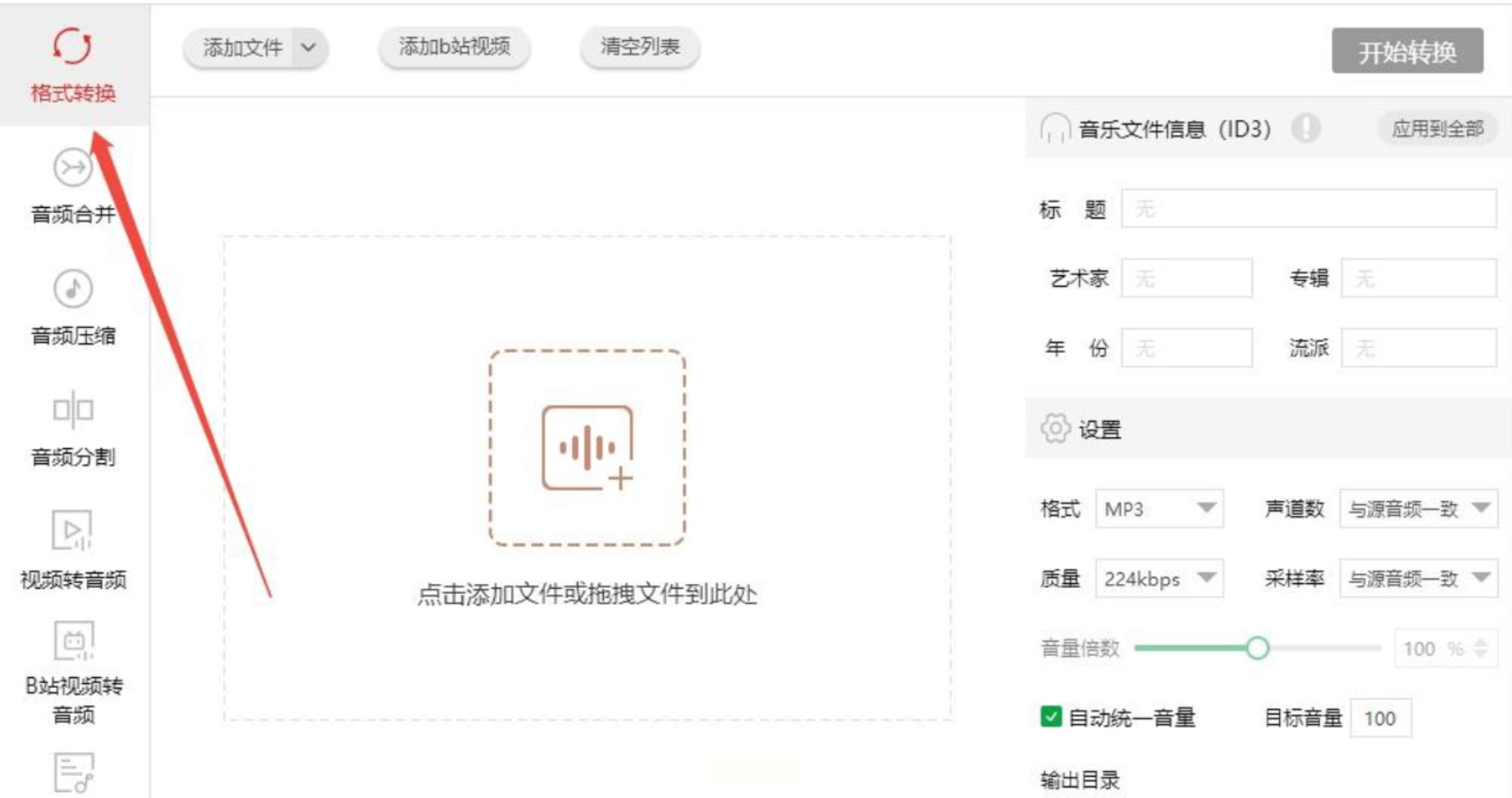 1. 打开软件后点「音频转换」(界面像老版QQ,按钮超大,第一次用也不会点错)