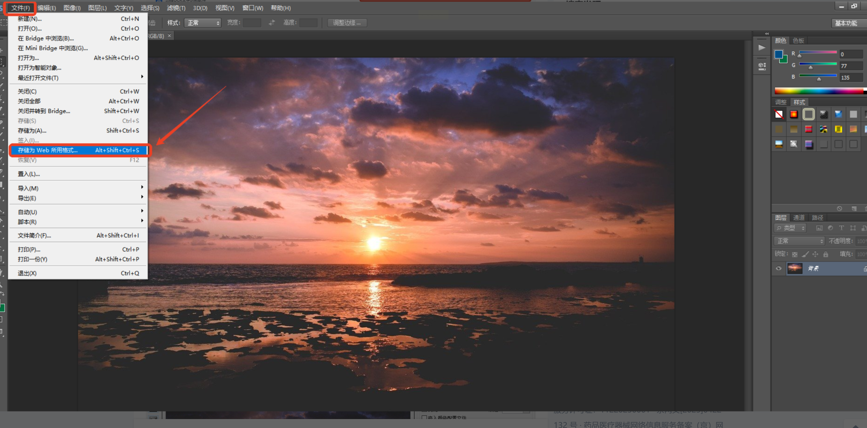 2. 选择存储格式:图片打开后,点击“文件”菜单,在下拉列表中找到并选择“存储为Web所用格式”(旧版PS可能叫“导出为”)。这个功能是专门为优化网络图片设计的。