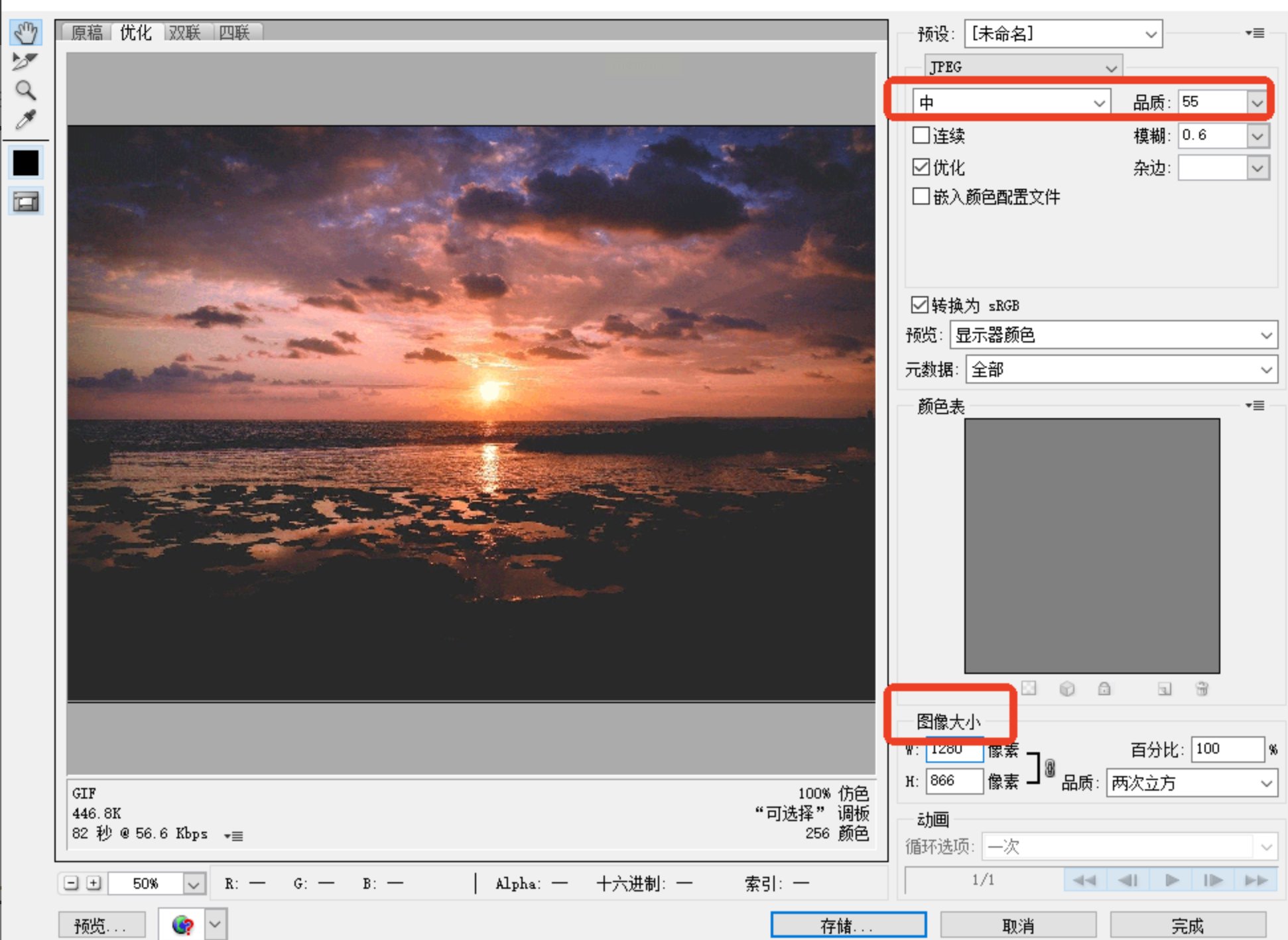 - 尺寸:修改宽度和高度(比如原图2000像素,调到1200像素),尺寸变小能显著减体积。