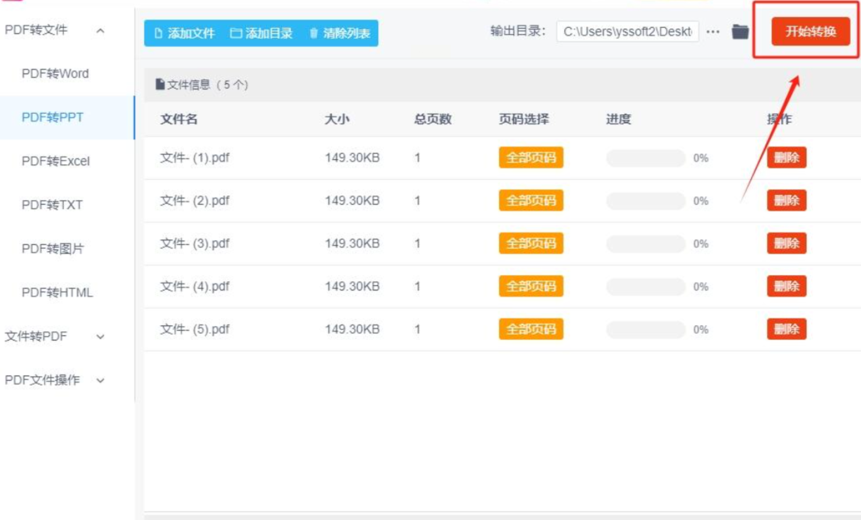 5. 如果PDF文件页数较多,可以点击文件名旁的页码设置(如“全部页码”),选择只转换特定范围的页面。同时,可以在输出设置中选择PPT的格式版本(如.pptx或.ppt)。