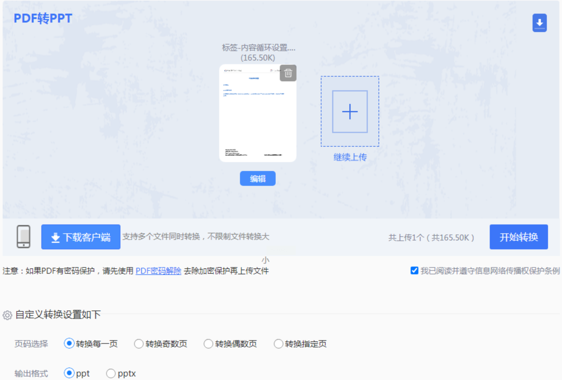 3. 文件上传后,可以根据需要设置转换选项,例如选择转换全部页面或指定页码范围,以及确认输出格式为PPT。