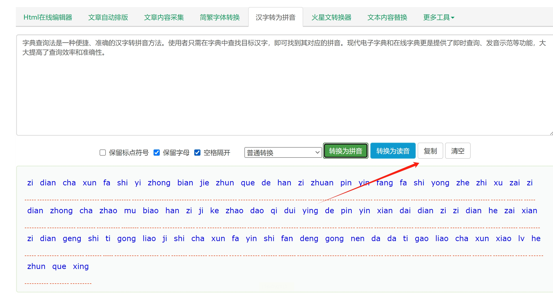 转换完成后,右侧文本框中会显示拼音内容。你可以直接选中这些拼音,或者点击“复制”按钮,将结果保存到本地文档或其他应用中。