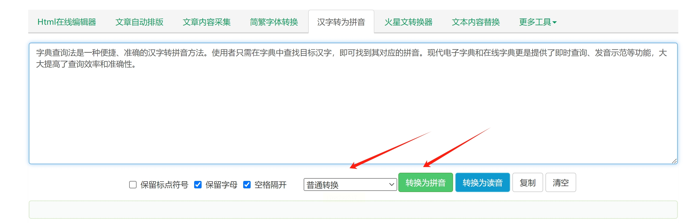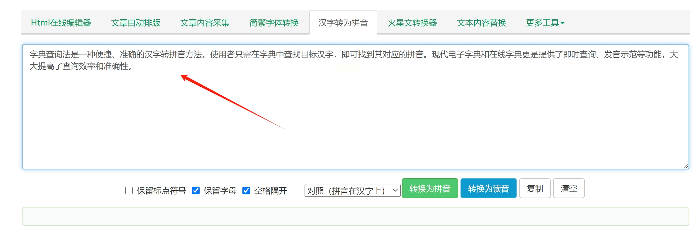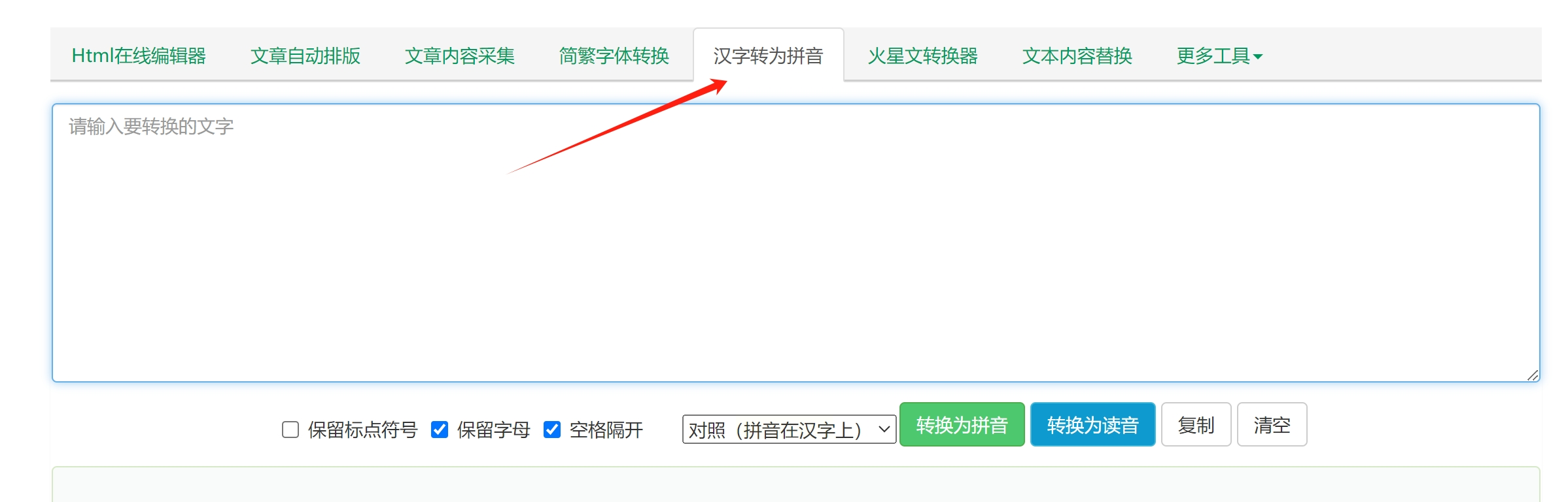 在输入框下方,找到“无汉字”或“仅拼音”选项并点击。这样,右侧的输出区域就会显示对应的拼音,而不保留原始汉字。