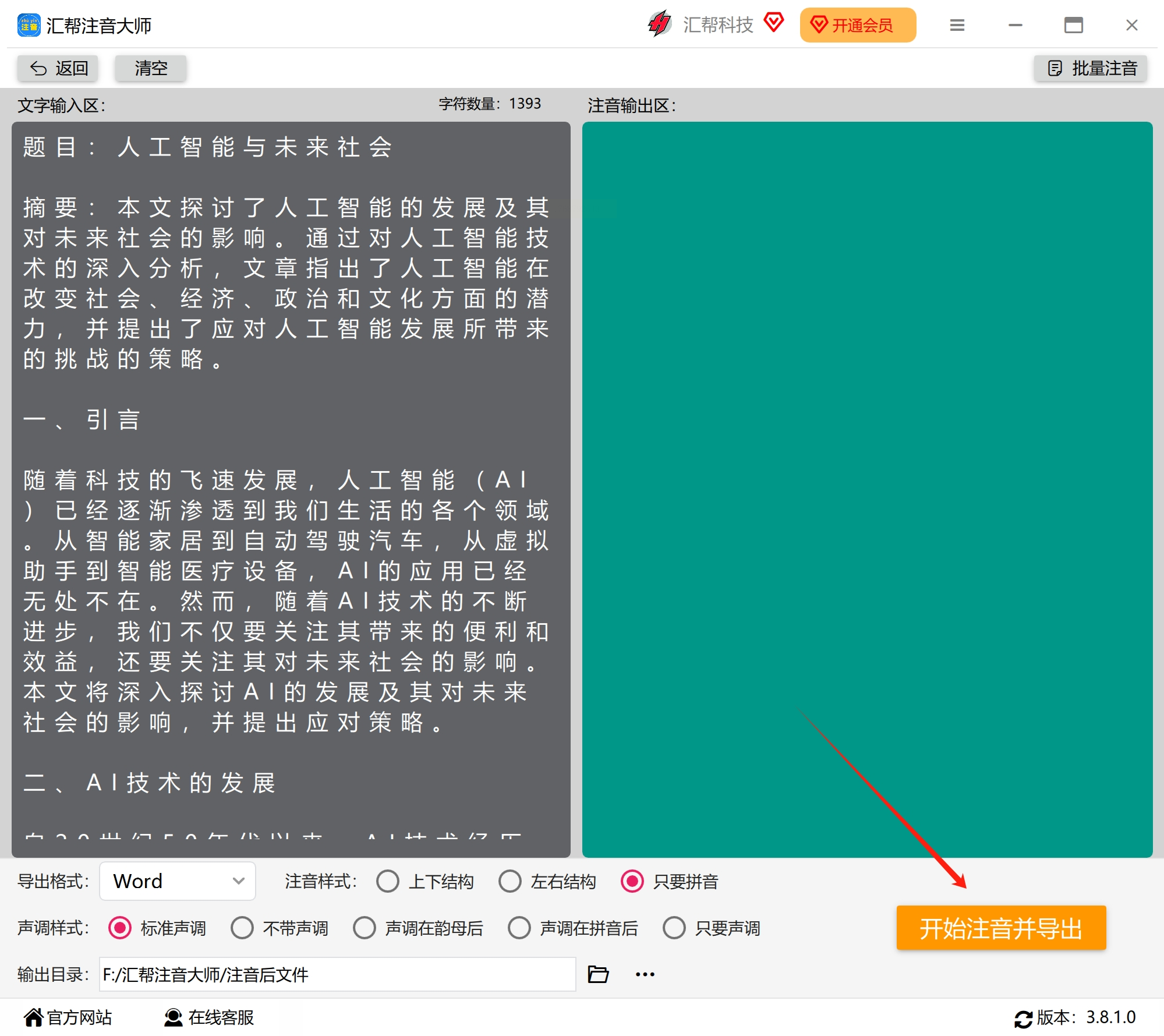 所有设置完成后,点击界面右下角的“开始注音并导出”按钮,软件就会开始处理文字。转换过程通常很快,稍等片刻即可完成。