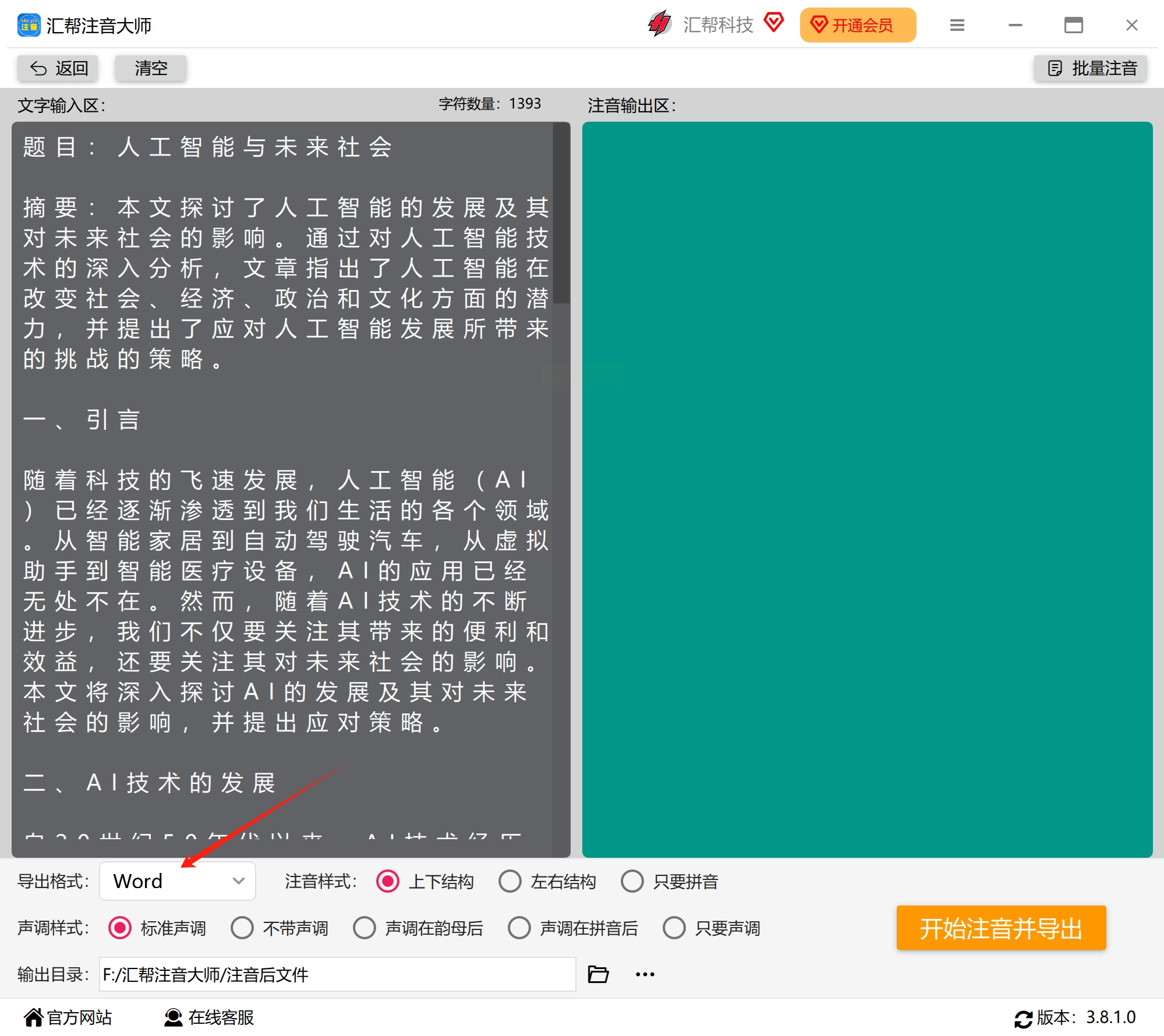 在文本输入区域的下方,有一个输出格式的设置选项。你可以根据需求选择输出文件的格式,例如Word文档、文本文件等。这里我们选择Word格式,这样转换后的拼音可以直接保存为可编辑的文档。