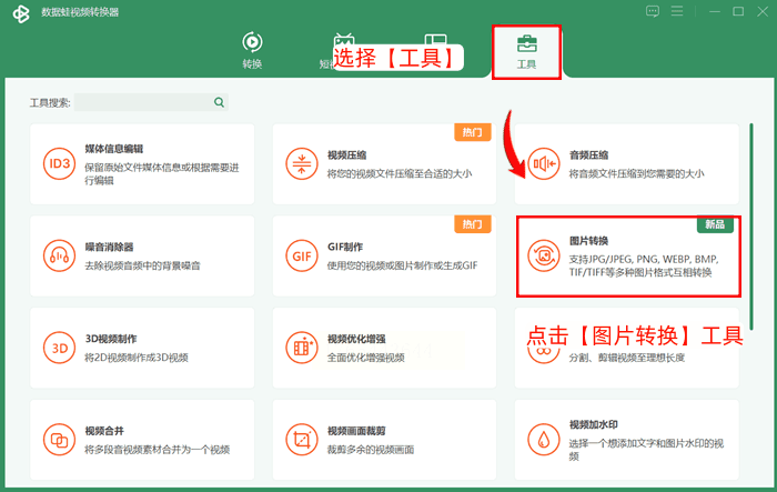 1. 先打开数据蛙软件,在主界面找“工具”菜单,点进去会看到一个“图片转换”的小图标,点它!
