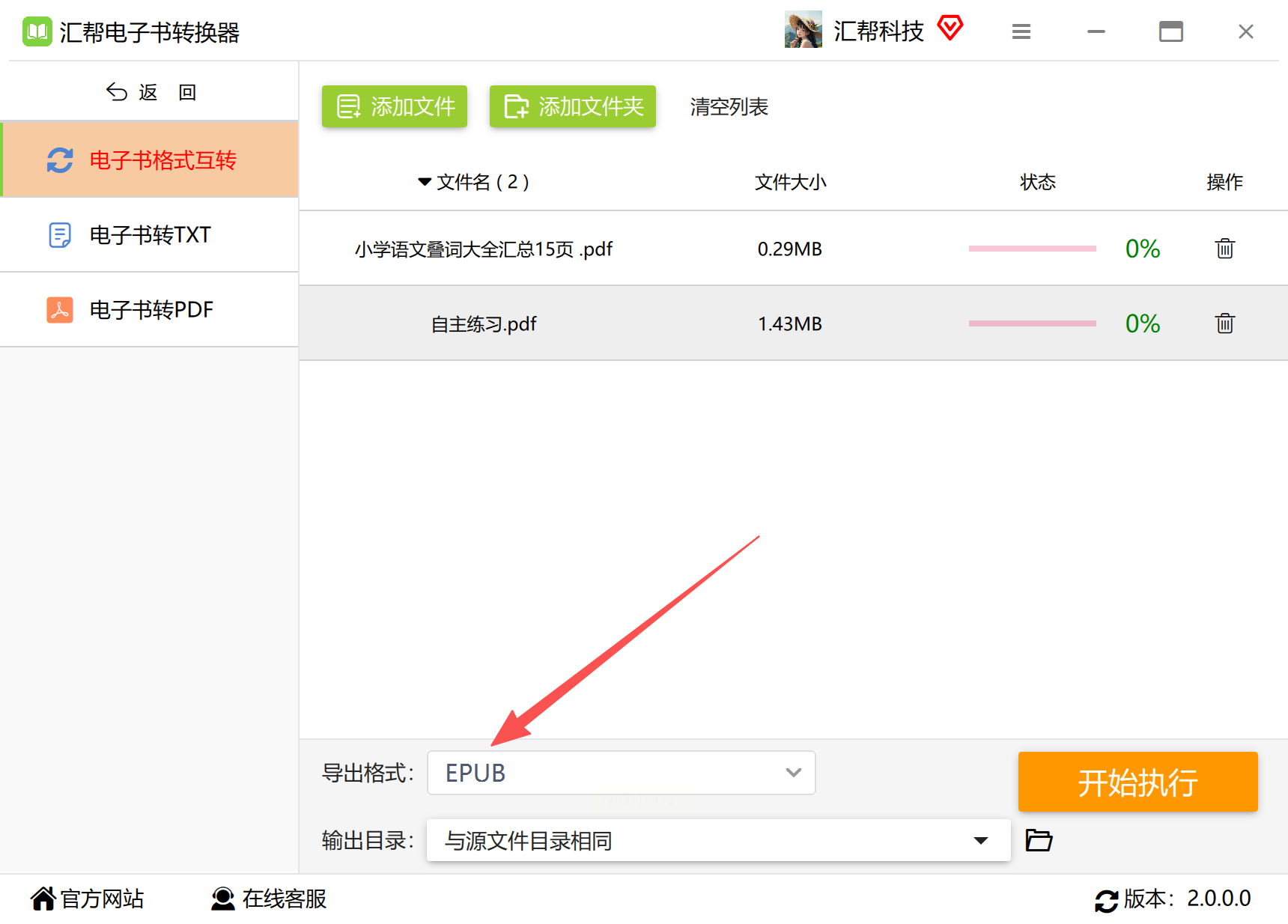 3. 选择输出格式为PDF:在输出设置区域,从格式列表中选择PDF作为目标格式。部分软件还提供PDF详细设置选项,如页面尺寸(A4、Letter等)、图像压缩率、是否保留EPUB中的超链接等。