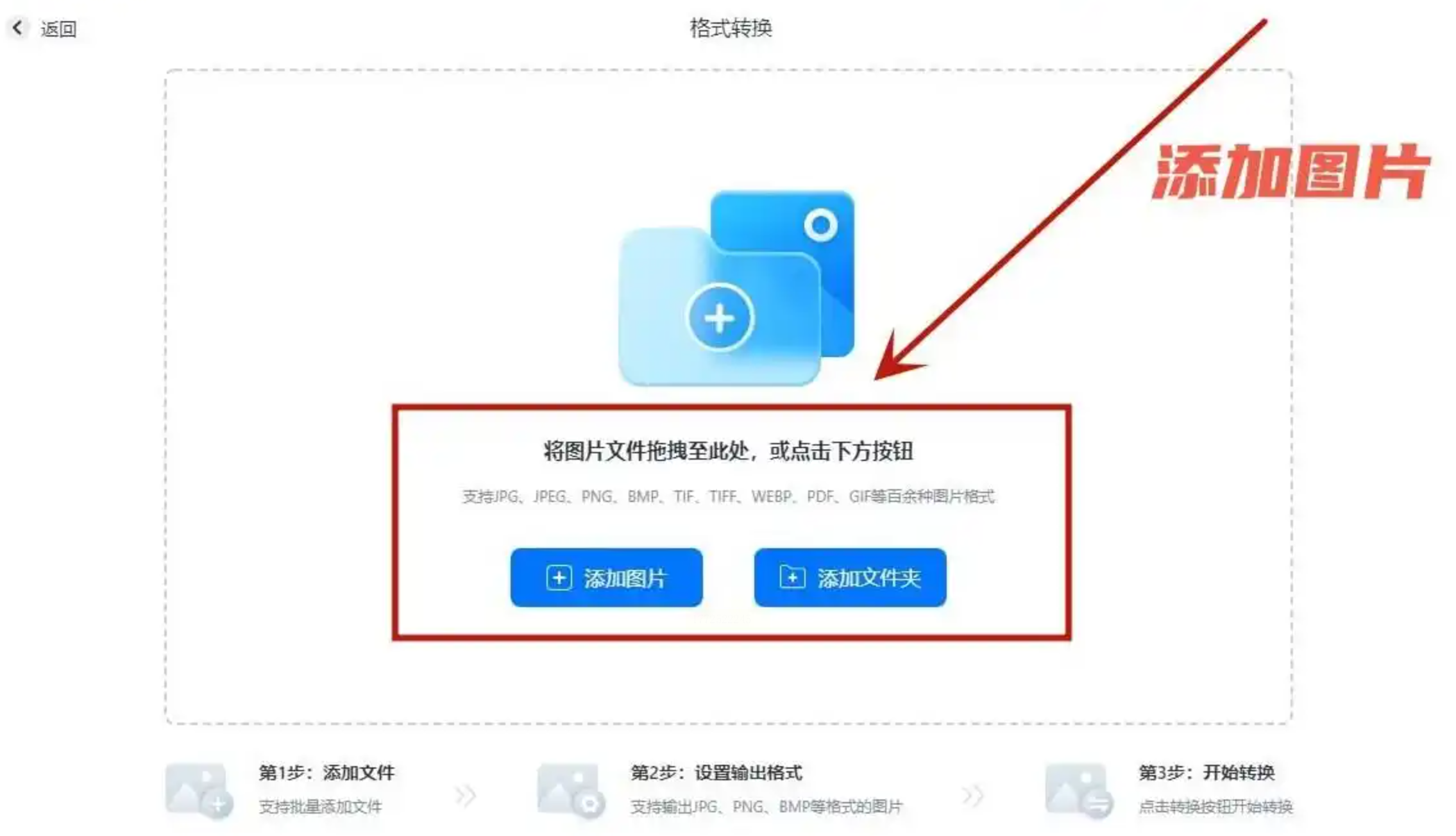 点击“添加图片”,选择要转格式的照片,支持单张或多张,转换时自动保持图片比例。