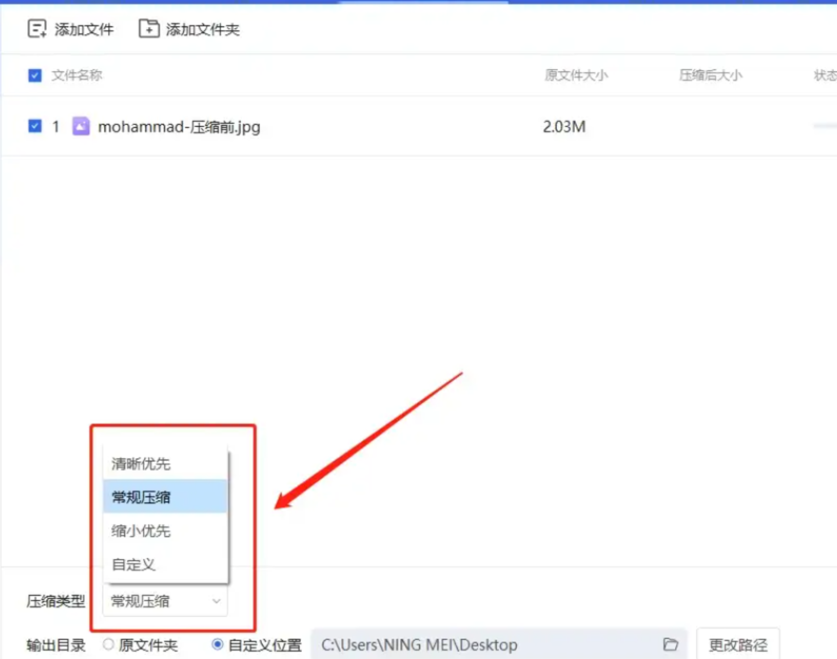 步骤二: 添加一张或多张图片。在软件界面右侧,提供了多种压缩模式,例如“普通压缩”、“强力压缩”等。如果对大小有精确要求,还可以使用“自定义”模式手动输入目标文件大小或压缩参数。