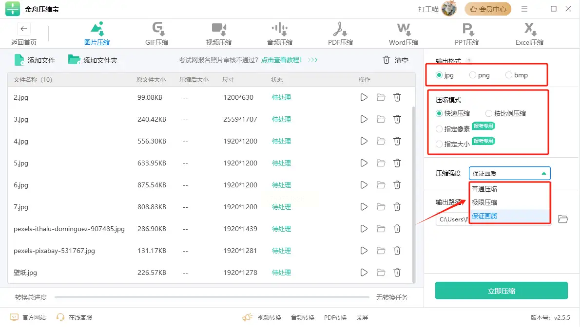 步骤二: 导入需要处理的图片。在软件右侧,你可以分别设置输出后的图片格式、选择不同的压缩模式(如清晰优先或缩小优先),以及调整压缩强度等级。