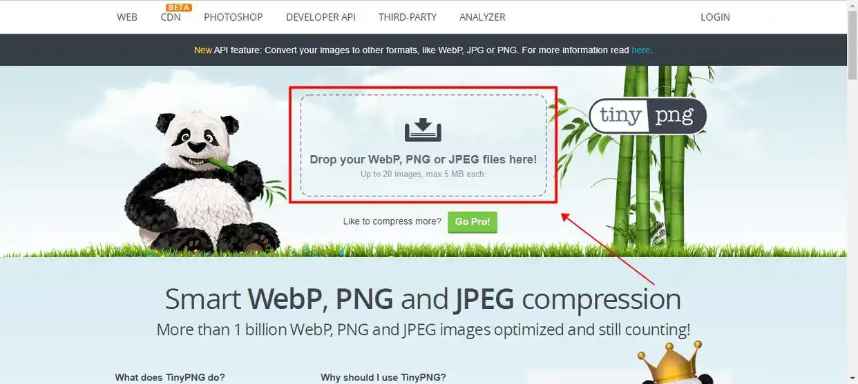 步骤一: 访问TinyPNG官网,你会看到一个非常醒目的虚线拖放区域。