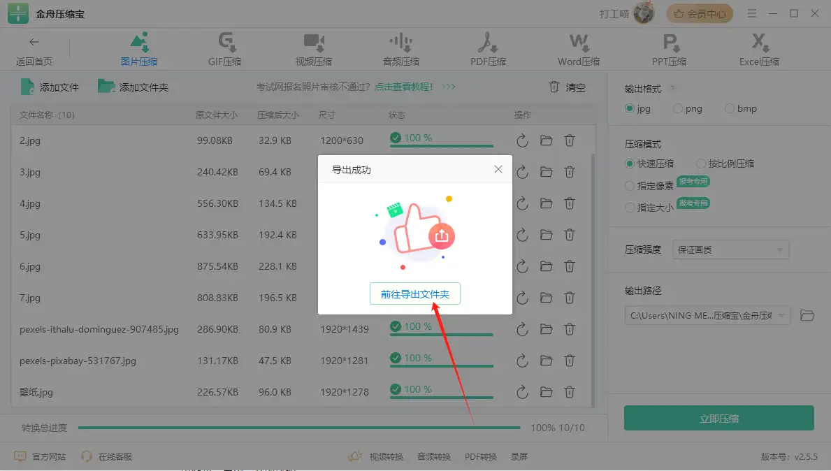 步骤四: 点击“立即压缩”按钮启动任务。完成后,软件通常会提供快捷入口,让你能立刻跳转到导出文件夹查看成果。