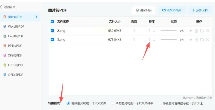 - 图片顺序调整:添加图片后,可以点击图片右侧的箭头图标调整顺序,顺序将对应PDF文件的页面顺序。