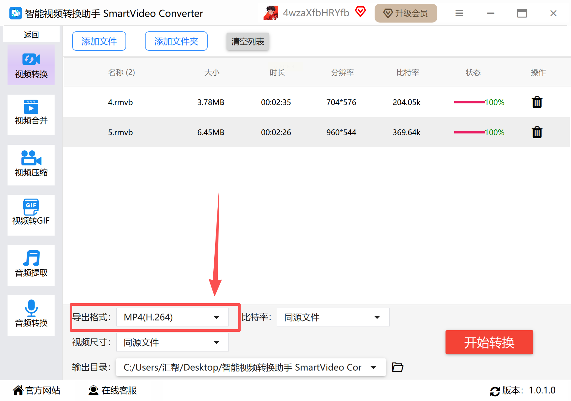 1. 选择转换功能:打开软件后,主界面"视频转换"按钮会自动高亮,点击进入后可选择"RMVB转MP4"专属模板。