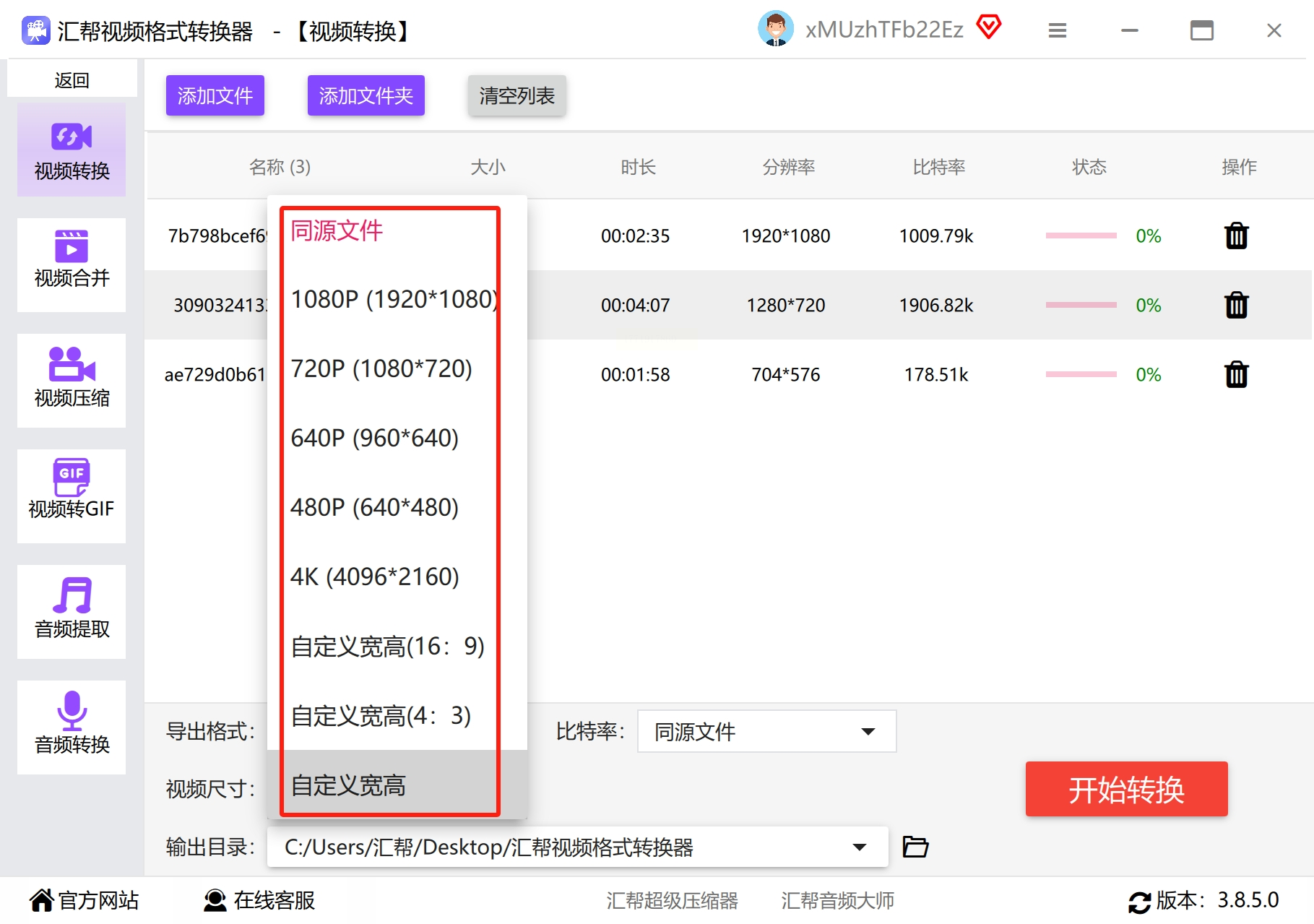 3. 格式与参数设置:在"输出格式"下拉框选择"MP4",下方会自动显示预设的分辨率选项(320P到1080P)。若需自定义参数,可点击"高级设置"调整帧率和码率(建议新手保持默认值)。