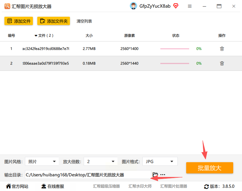 汇帮支持批量上传,导入多张图片后,设置好参数和输出目录,点击“批量放大”,就能一次性处理所有图片,很方便。
