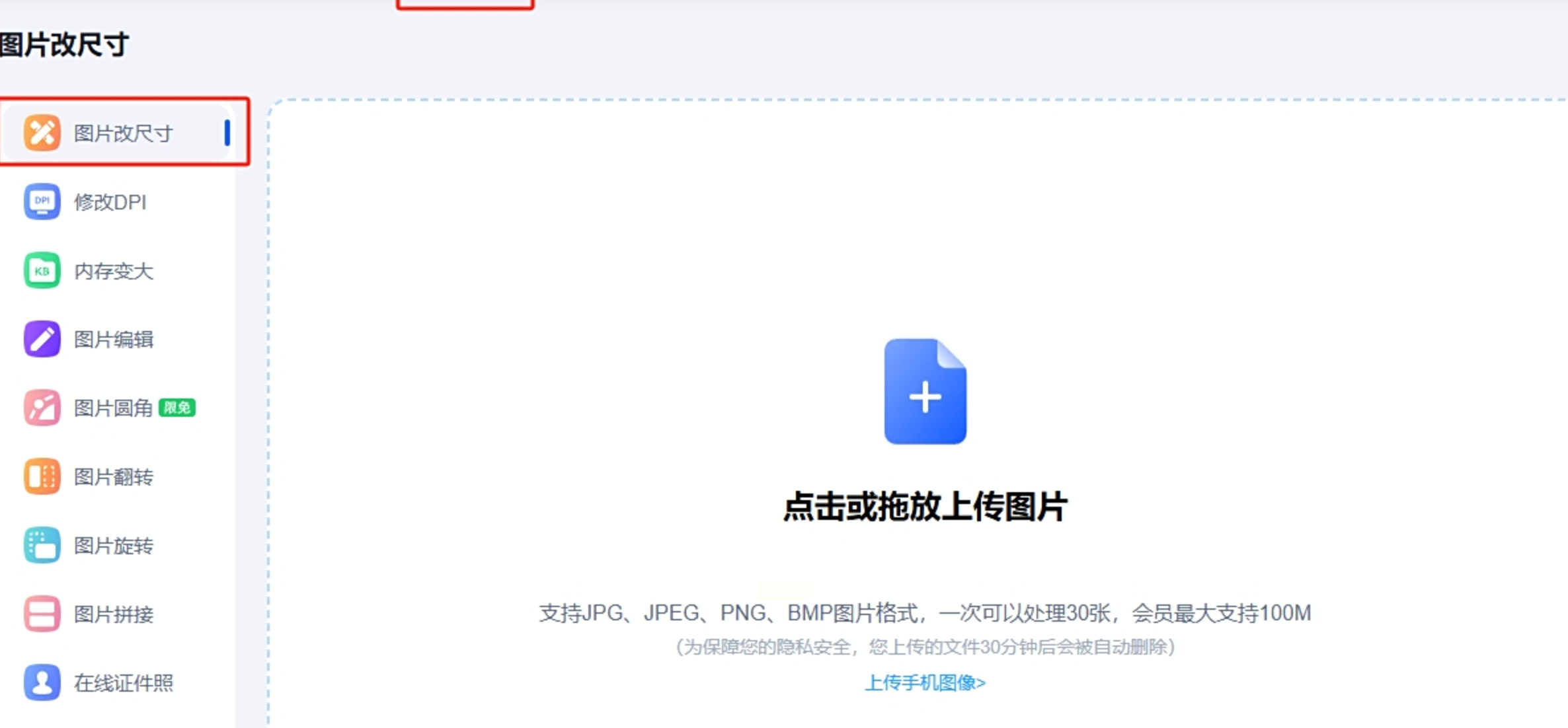 步骤一:打开软件后,点击左侧「批量改尺寸」功能模块,进入尺寸调整主界面。