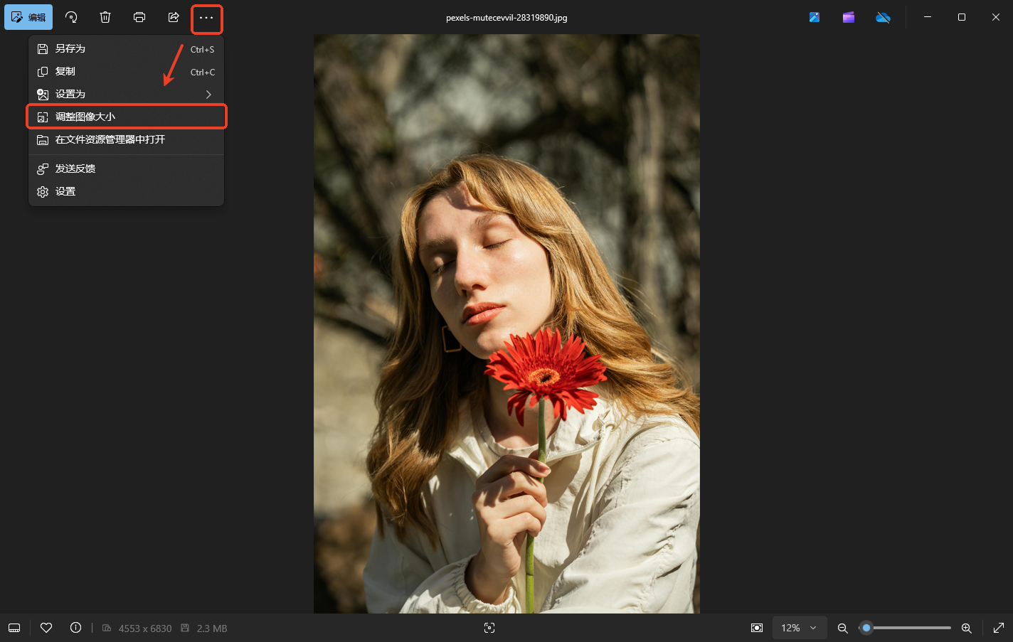 步骤二:点击界面右上角三点菜单,选择「调整图像大小」。