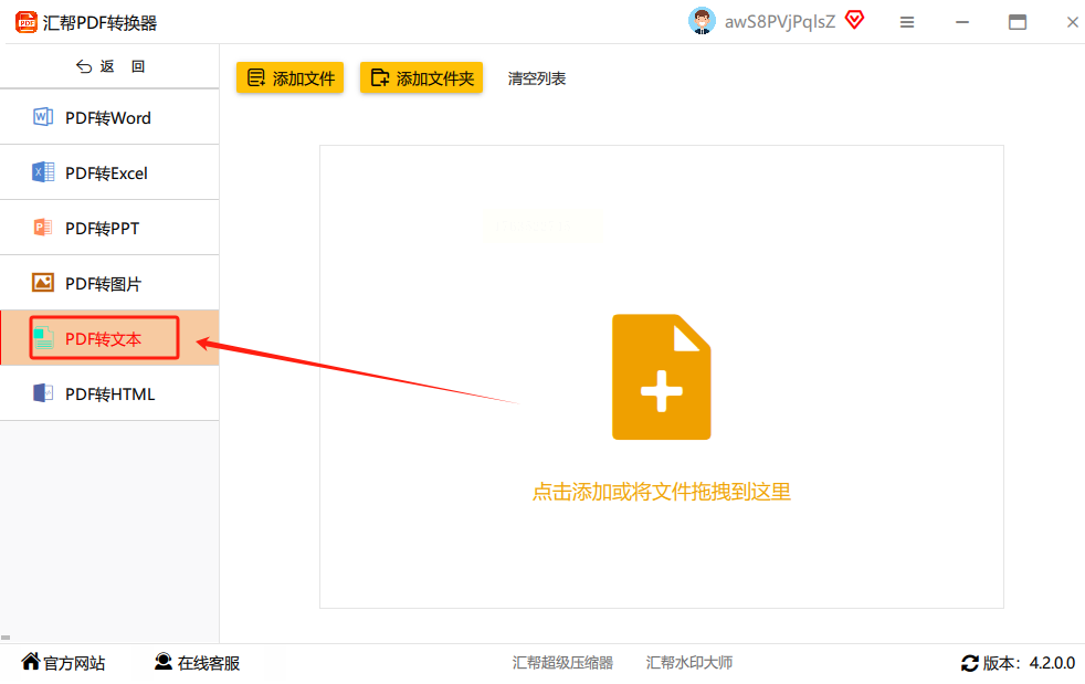 1. 打开软件,选择功能:启动汇帮PDF转换器后,在主界面找到「PDF转文件」选项卡,点击进入后你会看到左侧菜单里有「PDF转文本」的选项,这正是我们需要的TXT格式入口。