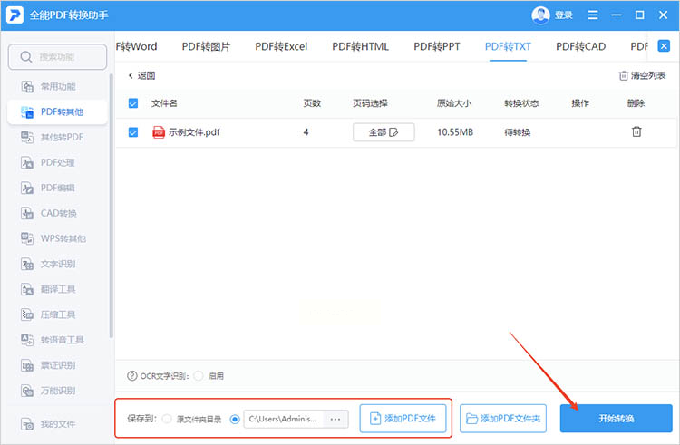 2. 设置输出参数:在右侧设置区域,选择「输出格式」为「TXT」,并设置「页面范围」(比如全部转换或指定页数)。如果需要,还能设置转换后的文本编码和是否保留图片,根据需求调整。