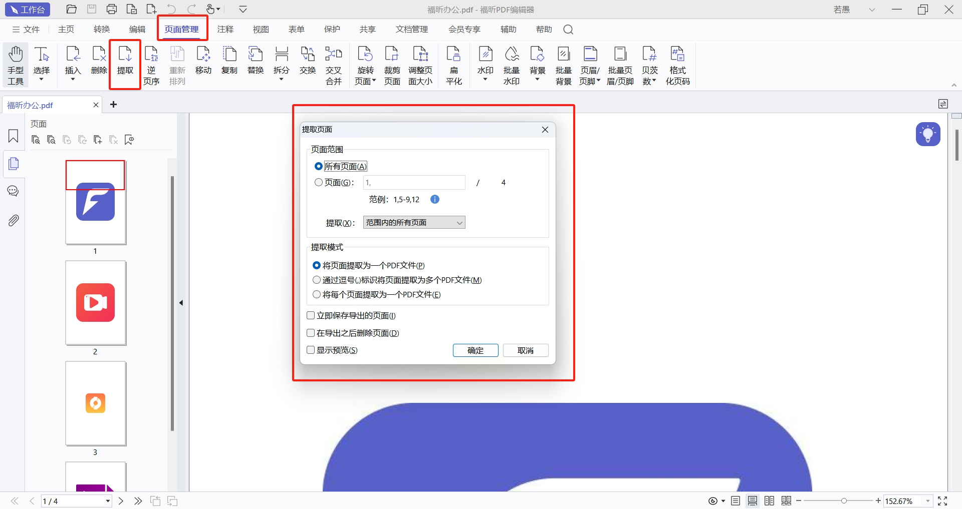优势:福昕支持PDF格式的转换和编辑,提取页面后还能直接在软件里编辑,适合需要二次处理的文件。