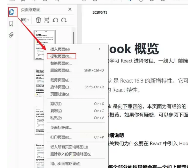 2. 右键提取页面:在左侧缩略图里找到要提取的页面,右键点击,选择“提取页面”。