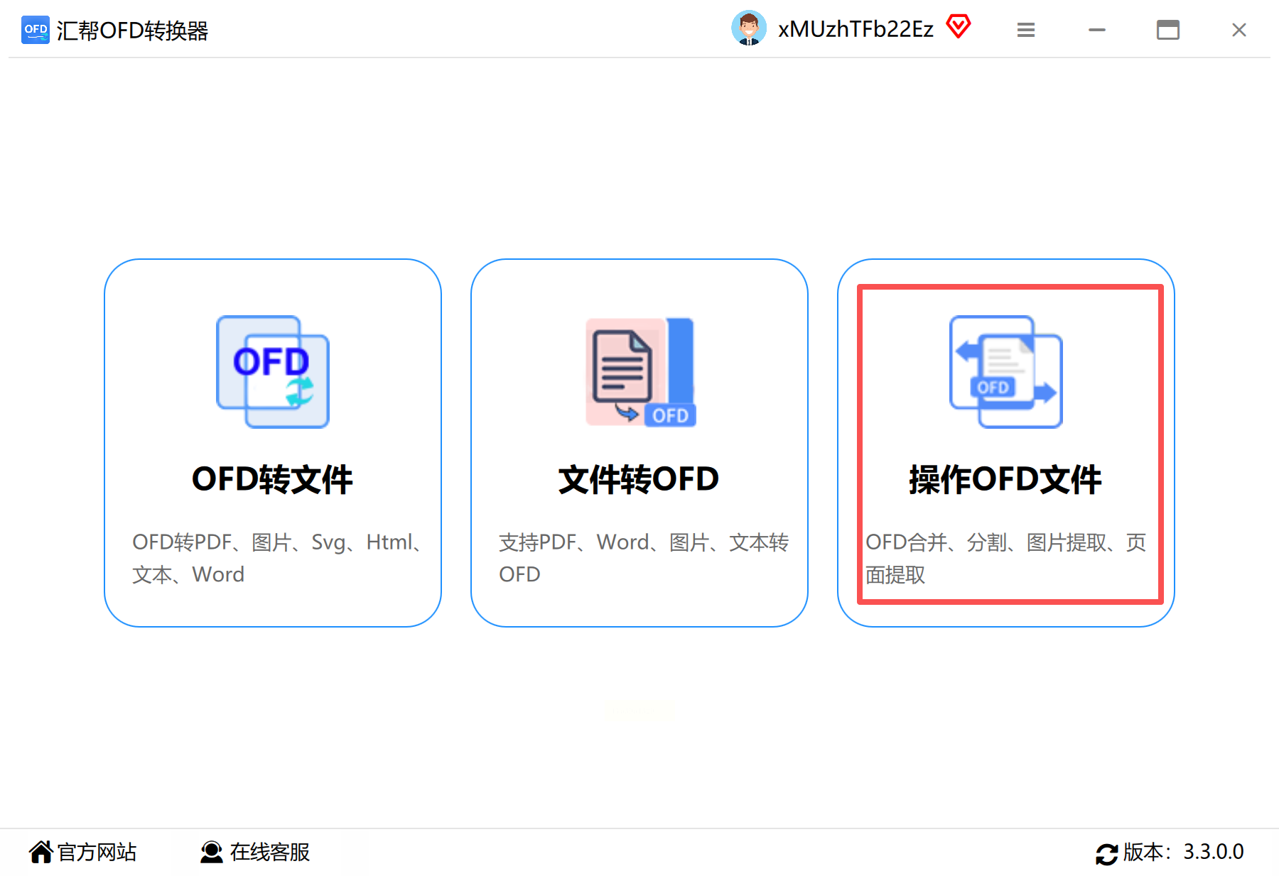 1. 启动软件:打开汇帮OFD转换器,界面左侧显示四大核心功能(合并/分割/提取/加密)