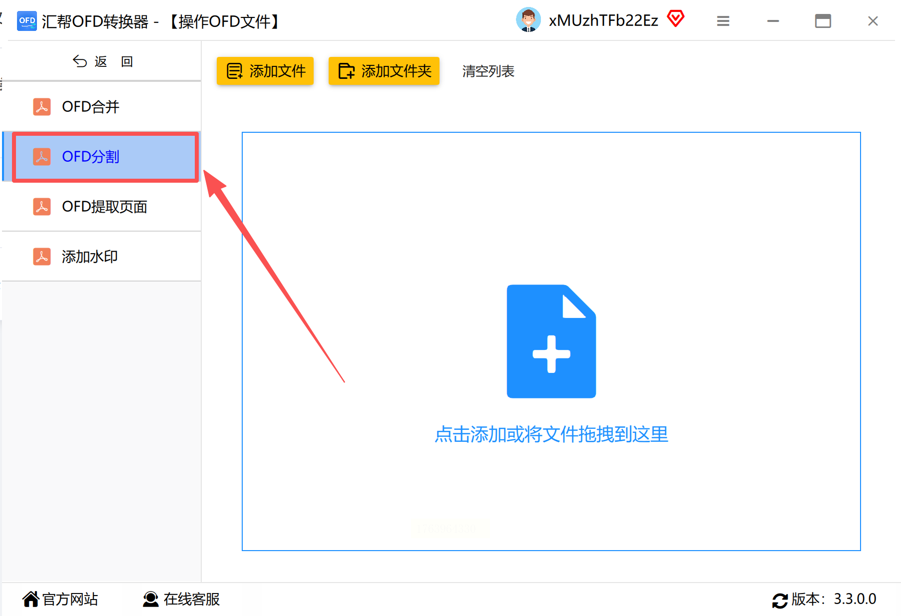 2. 选择分割功能:点击「OFD分割」图标(必须单独选择,避免误操作为合并功能)