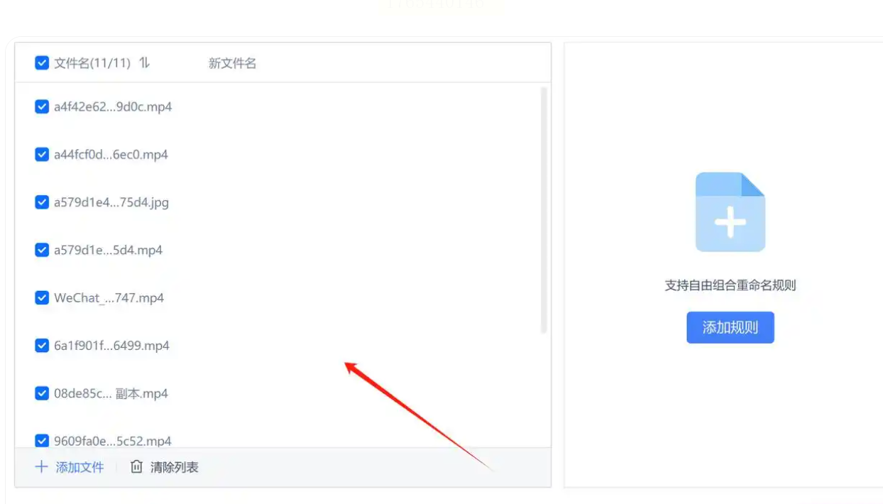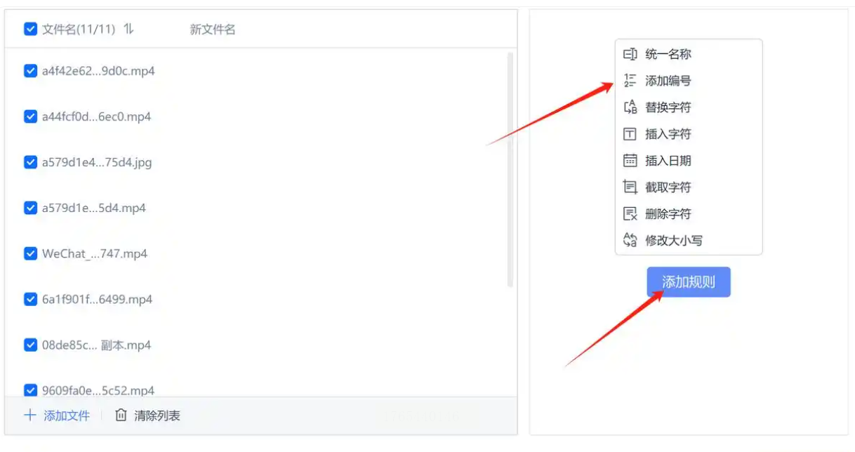 4. 设定你的编号规则:这时会弹出一个非常清晰的WPS重命名工具窗口。所有你选中的文件已经乖乖列在左边了。我们的重点在右边“命名规则”这里。