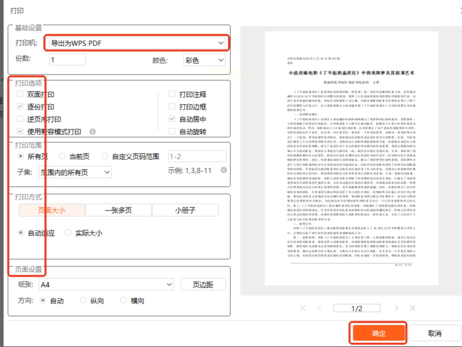 3. 选择PDF输出:点击“打印”按钮后,在打印机选择界面中,你会看到“导出为WPS PDF”或类似选项(具体名称可能因系统安装的软件而异)。选择这个选项,相当于将文件“打印”成PDF格式。
