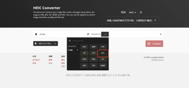 - 点击"选择文件"按钮,或者直接把手机里的HEIC图片拖到网页里。支持同时上传多张图片