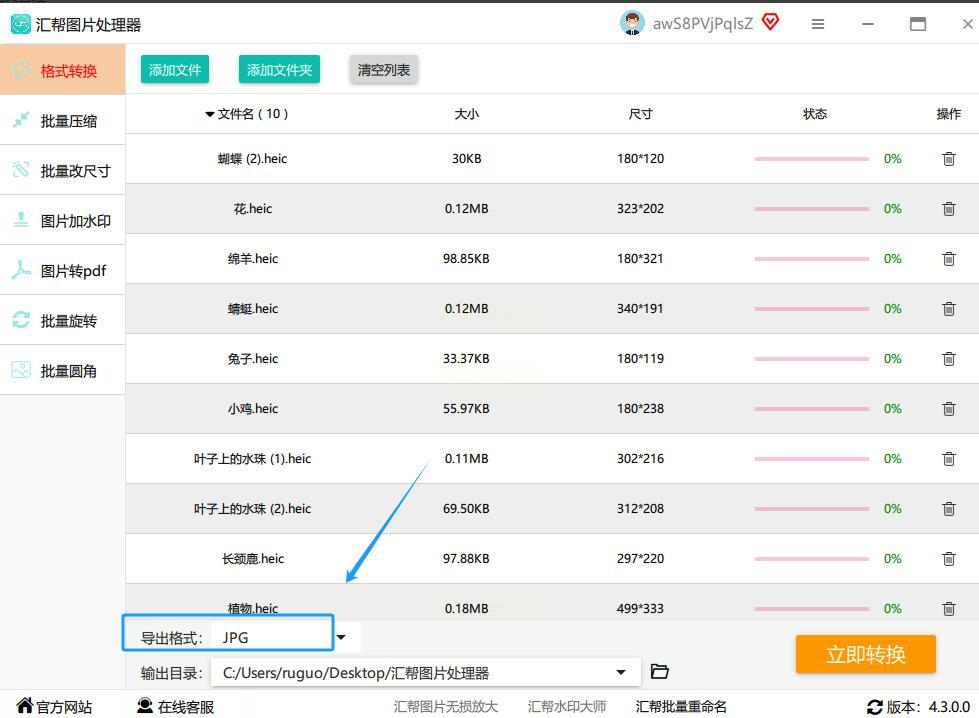 - 选择输出格式为JPG,部分工具还能调整压缩率(压缩率越低画质越好,但文件越大)。