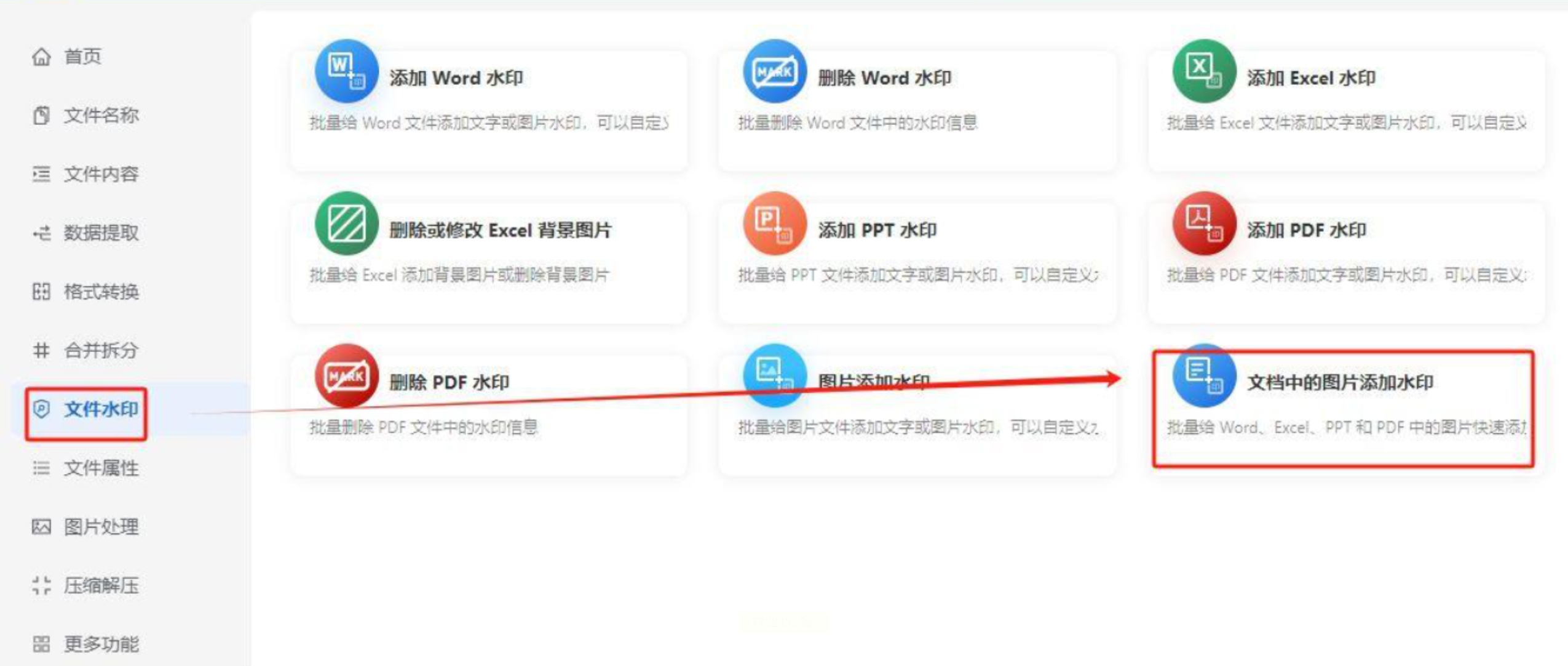 2. 选择“PDF加水印”功能: