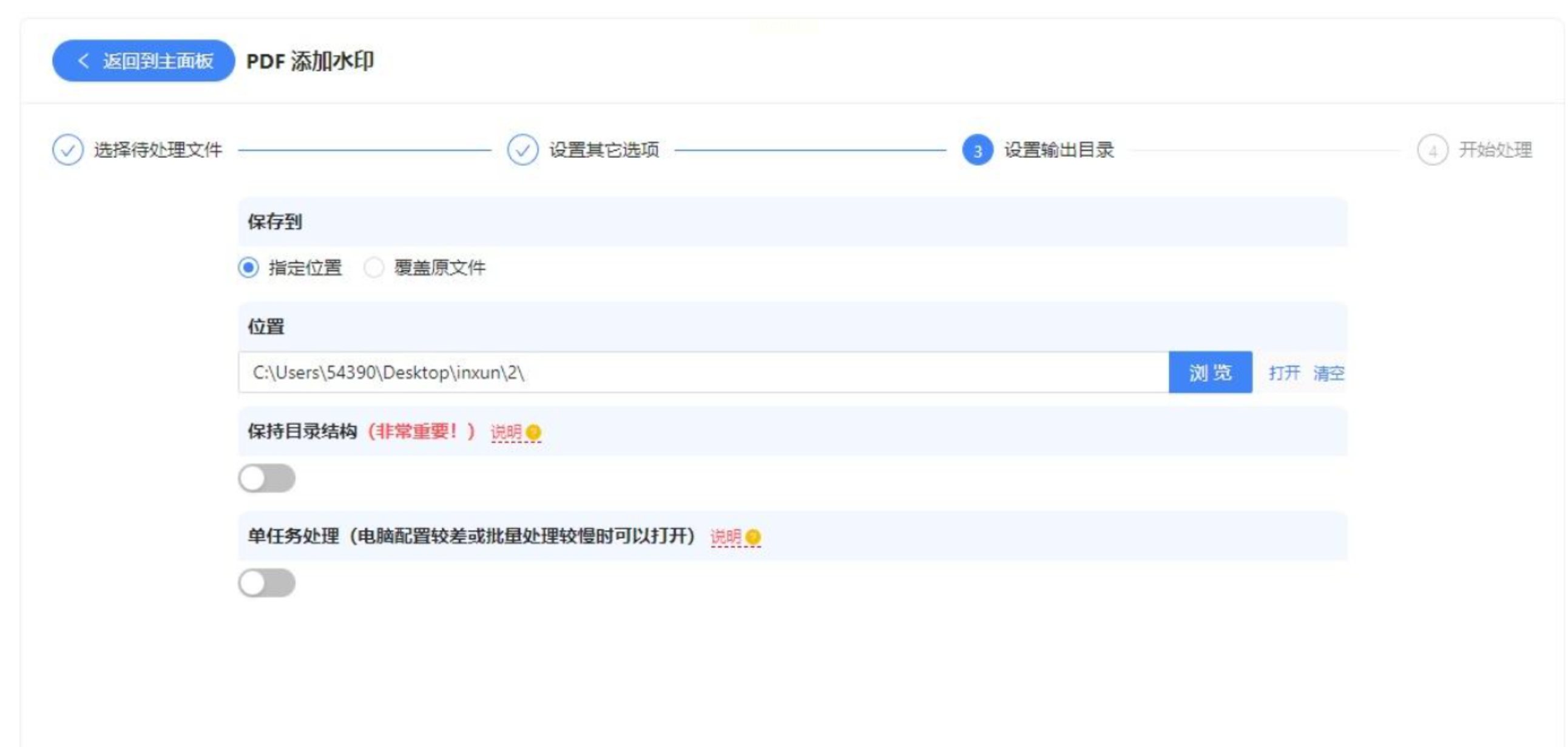 - 选好后,点“开始处理”,设置导出文件夹(比如新建一个“带水印PDF”文件夹),软件会自动处理所有文件。