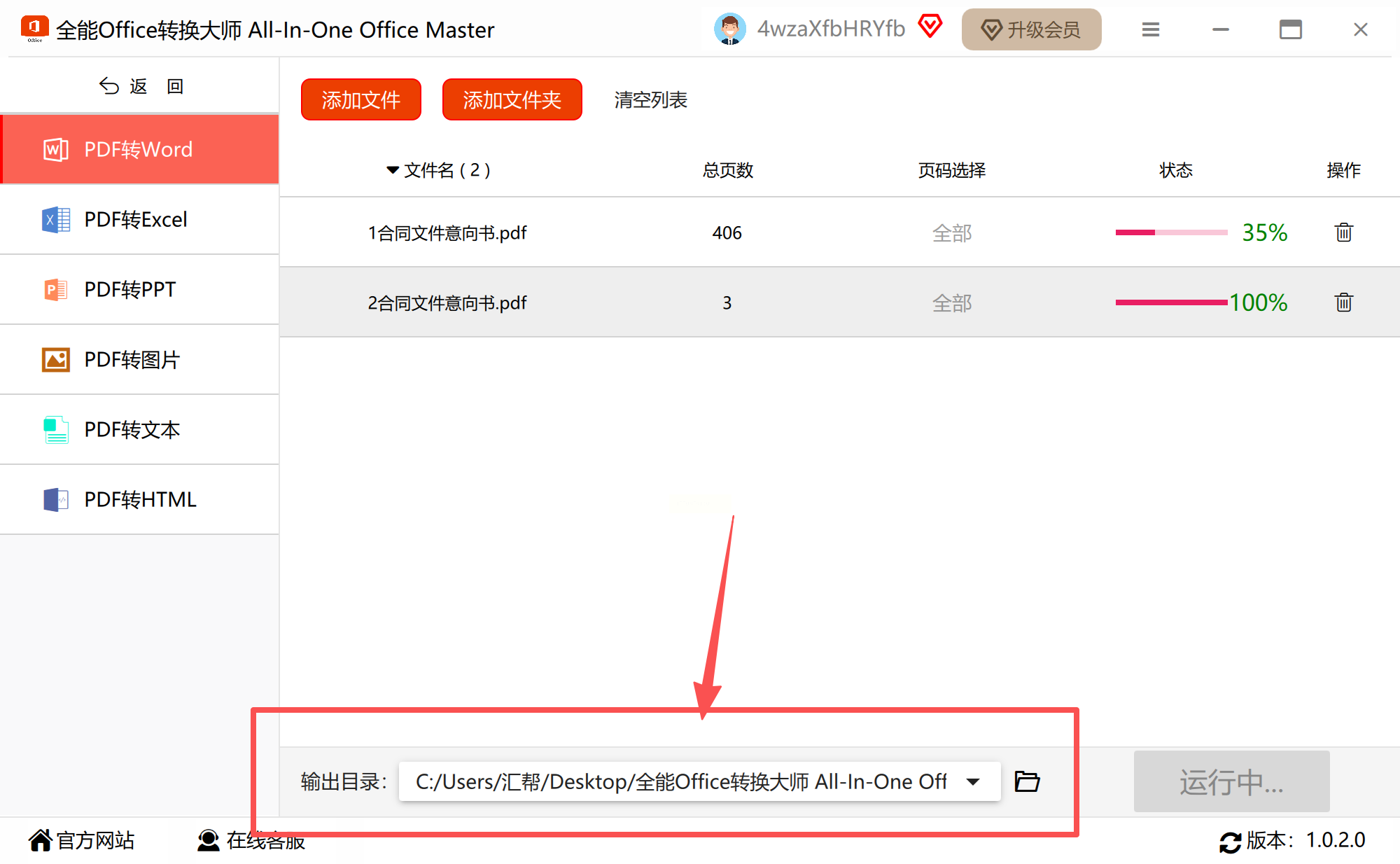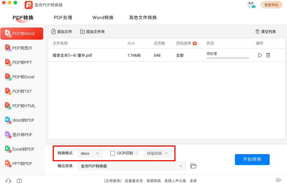 2. 上传后可根据需要调整输出格式(如DOCX或DOC)、页面范围及图像质量等参数,并设置专属保存目录。