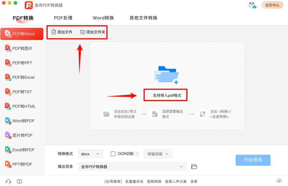 第一步:安装并打开软件,左侧功能栏默认选中“PDF转Word”。通过“添加文件”或拖拽方式导入PDF。